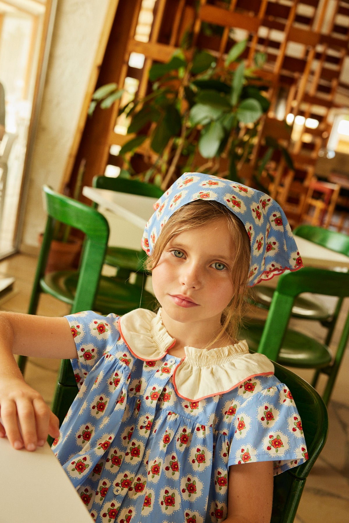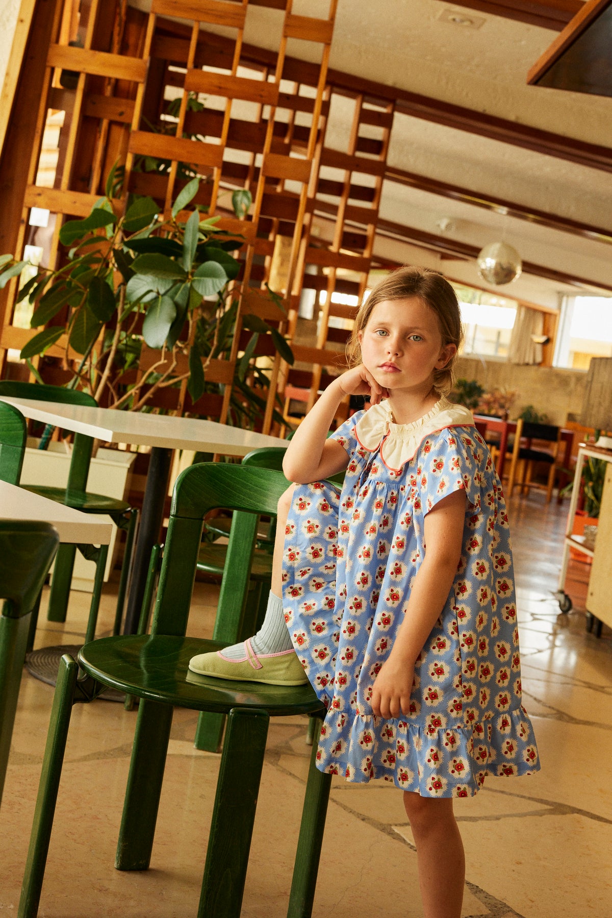 An all-over printed cotton poplin dress with fancy embroidered smocks. Lovely contrasted flounce collar with flower embroidery. Gathered sleeves with smocks and flounce above the elbow. Button back.
