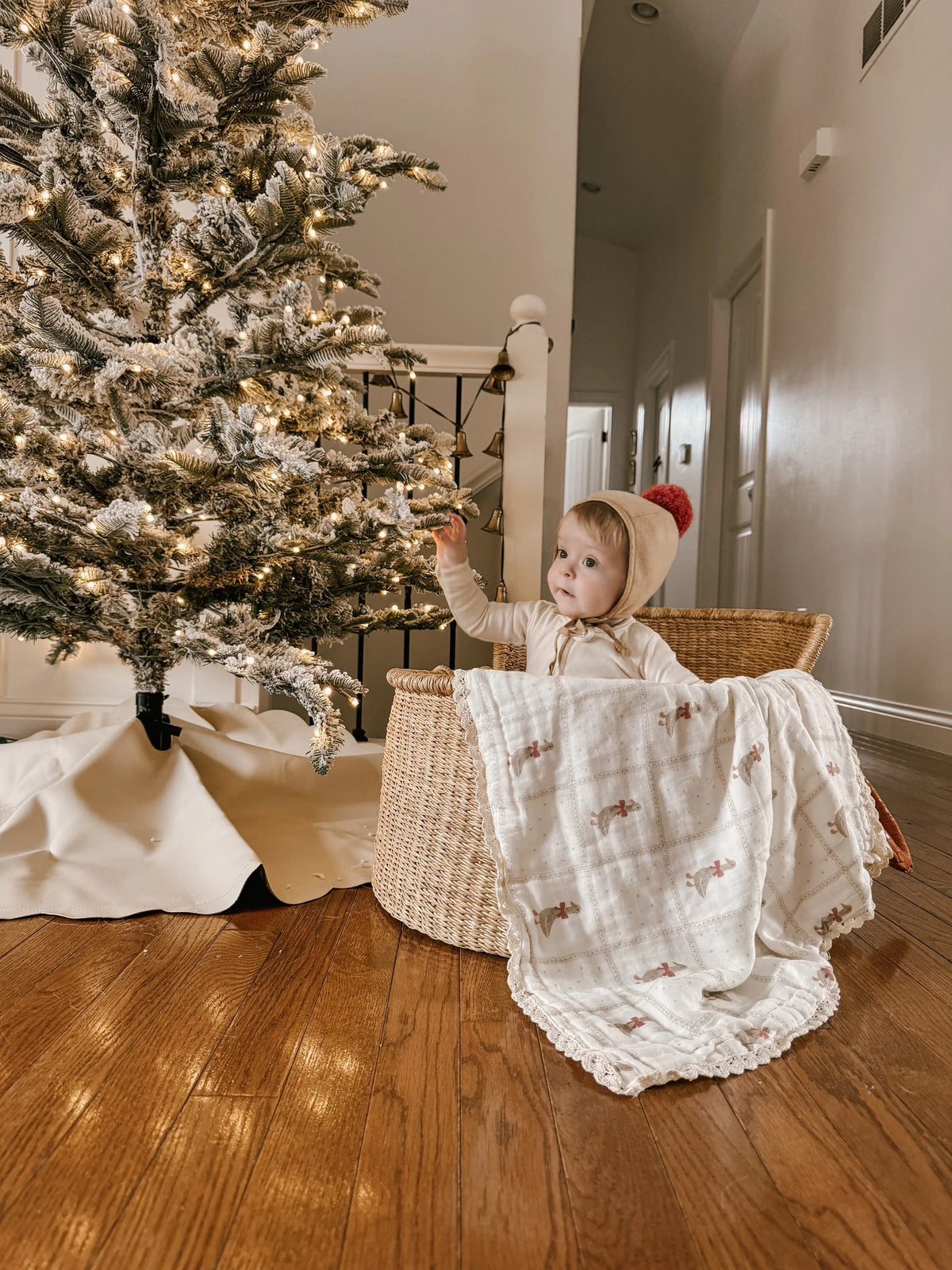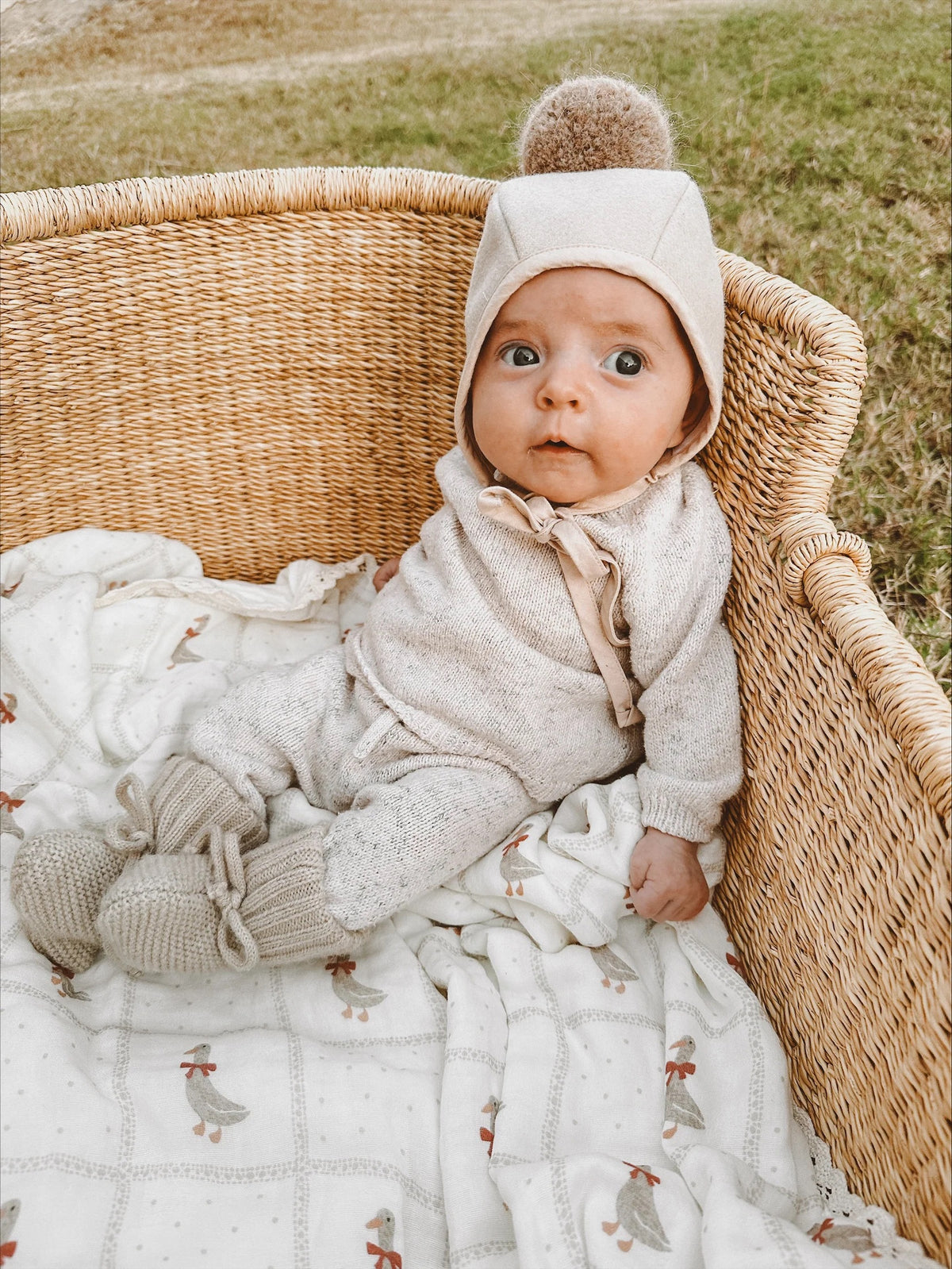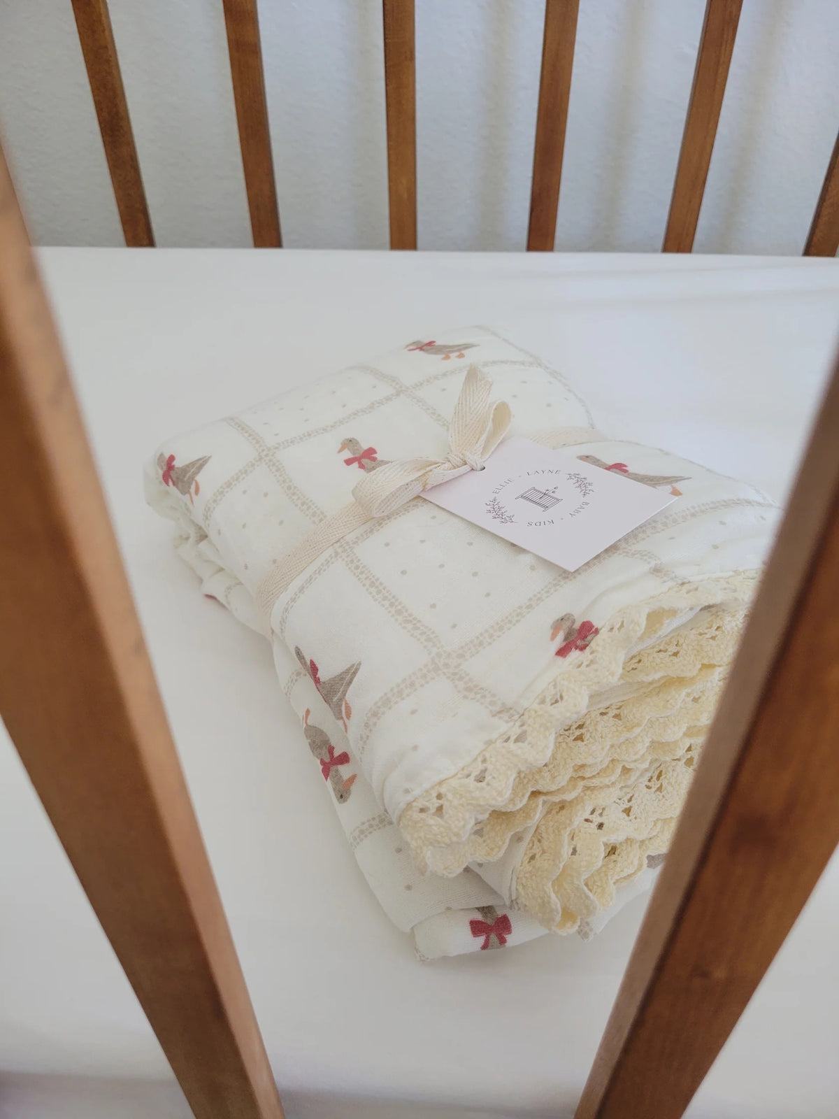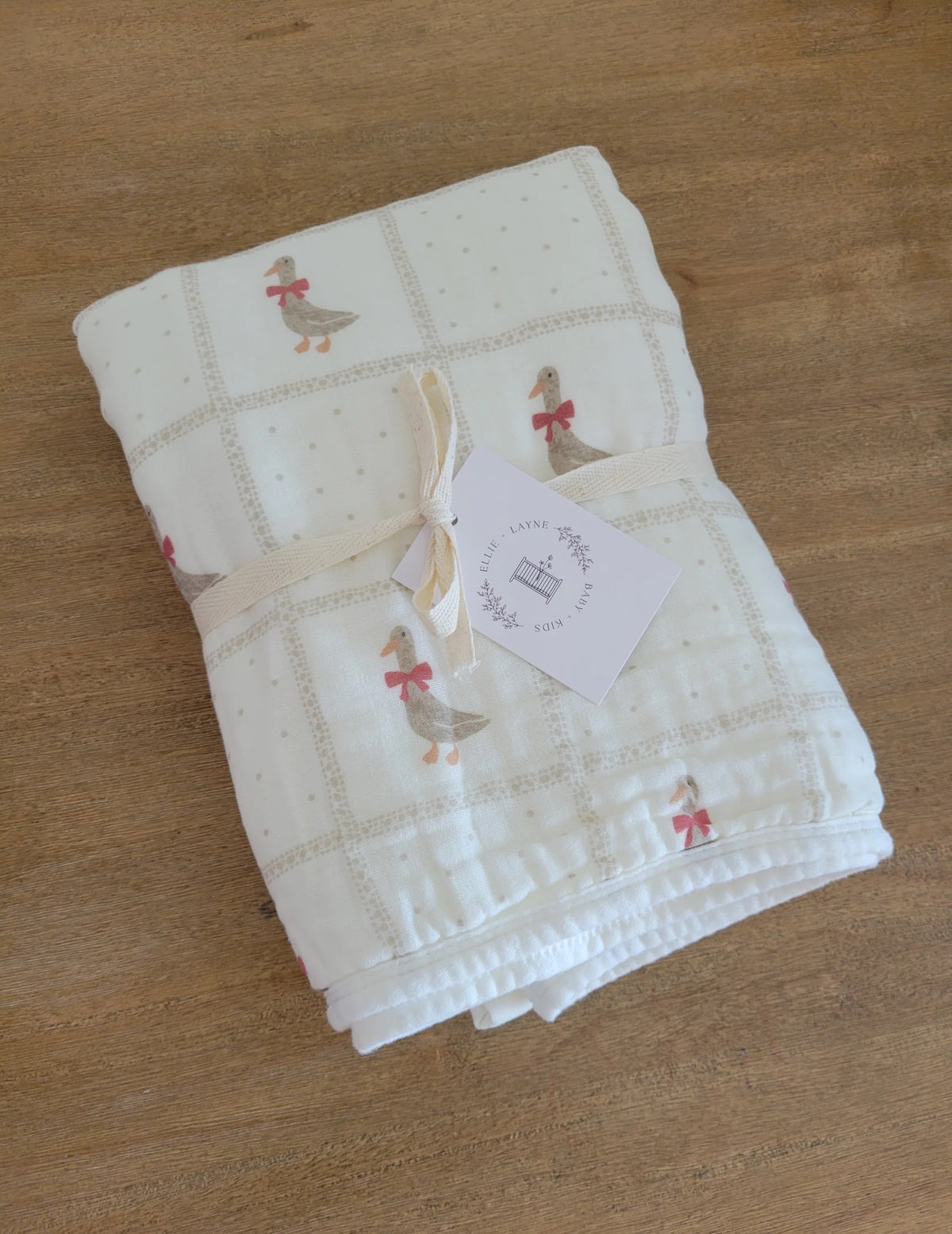 In collaboration with LR Studios, the new Holiday Goose blanket features beautiful Geese with red bows around the neck within a taupe gingham and dot design.