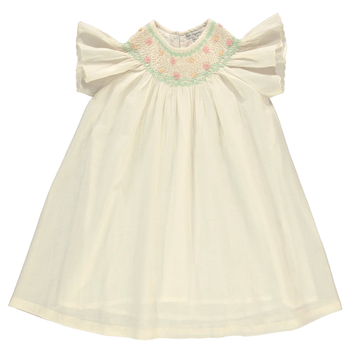 Introducing the lovely Luna butterfly dress - full of throwback charm. Crafted from the softest cotton in white. Features gently ruffled butterfly sleeves, hand smocked neckline with hand-made floral embroideries. As usual, a flouncy skirt - perfect for twirling.