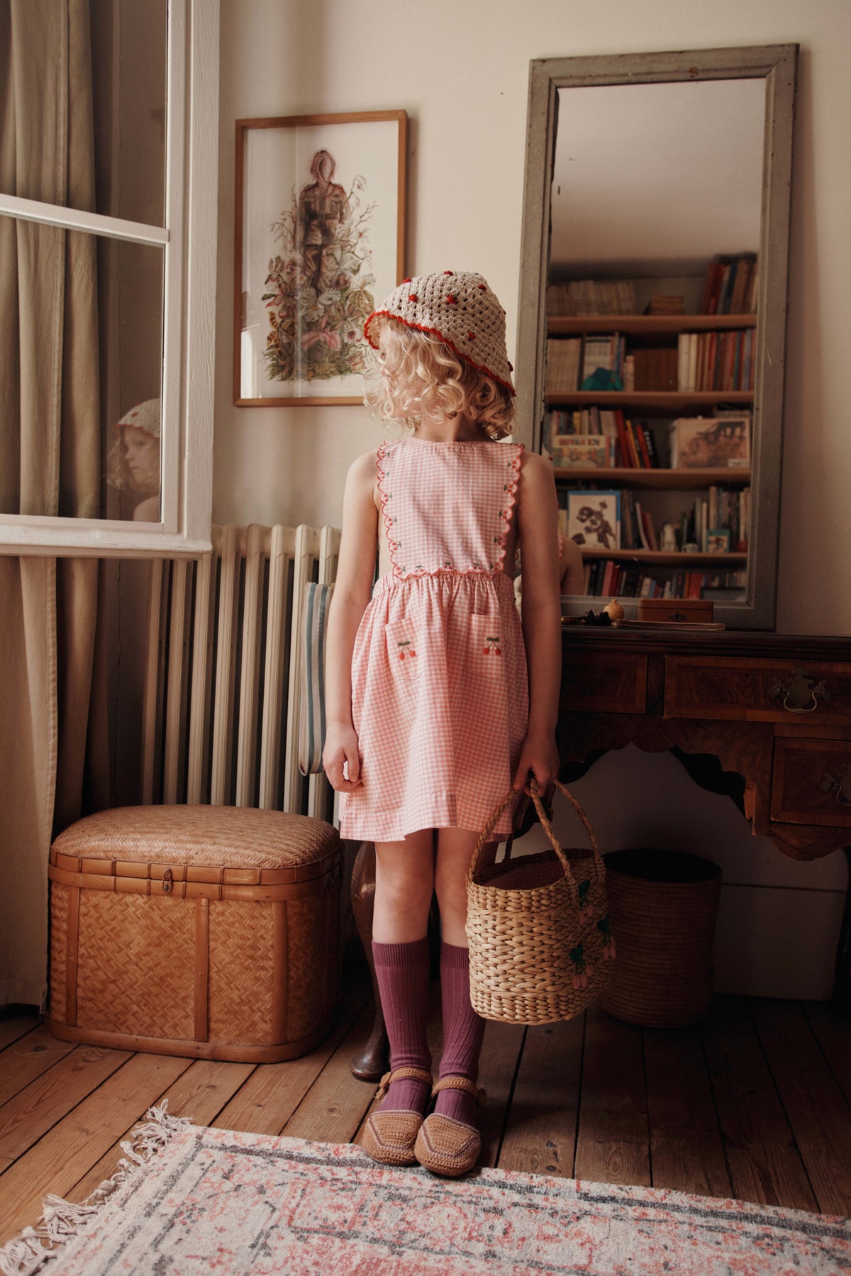 Apron dress in organic cotton gingham with small pink and ecru checks to give yourself the air of Brigitte Bardot in Saint-Tropez... or elsewhere.