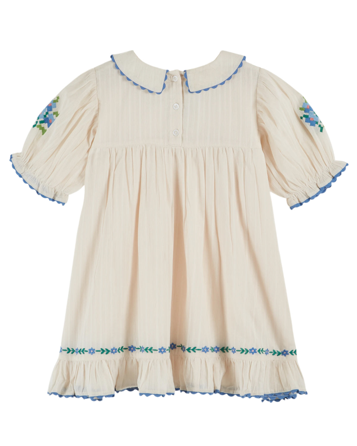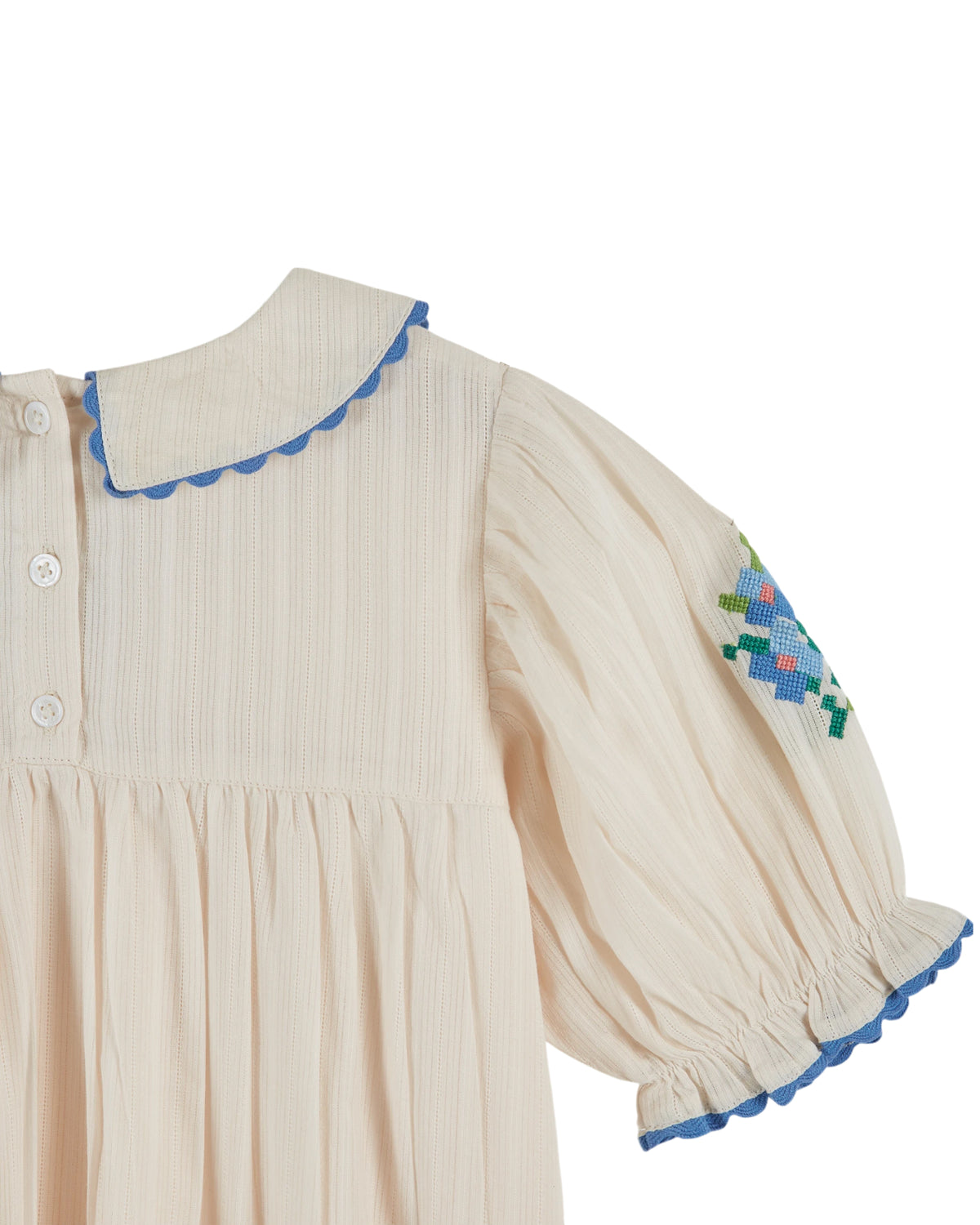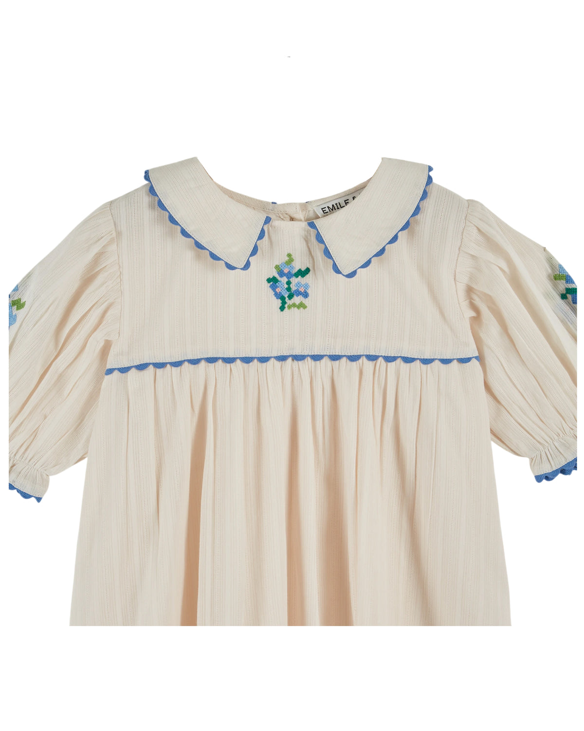 - Flowers embroidered in cross stitch on the yoke and on the sleeves