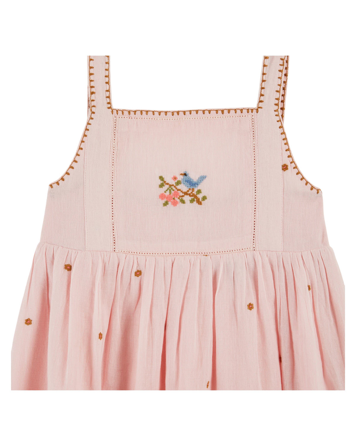 Pastel pink fine cotton gauze dress with straps, embroidered with small caramel-colored flowers all over.