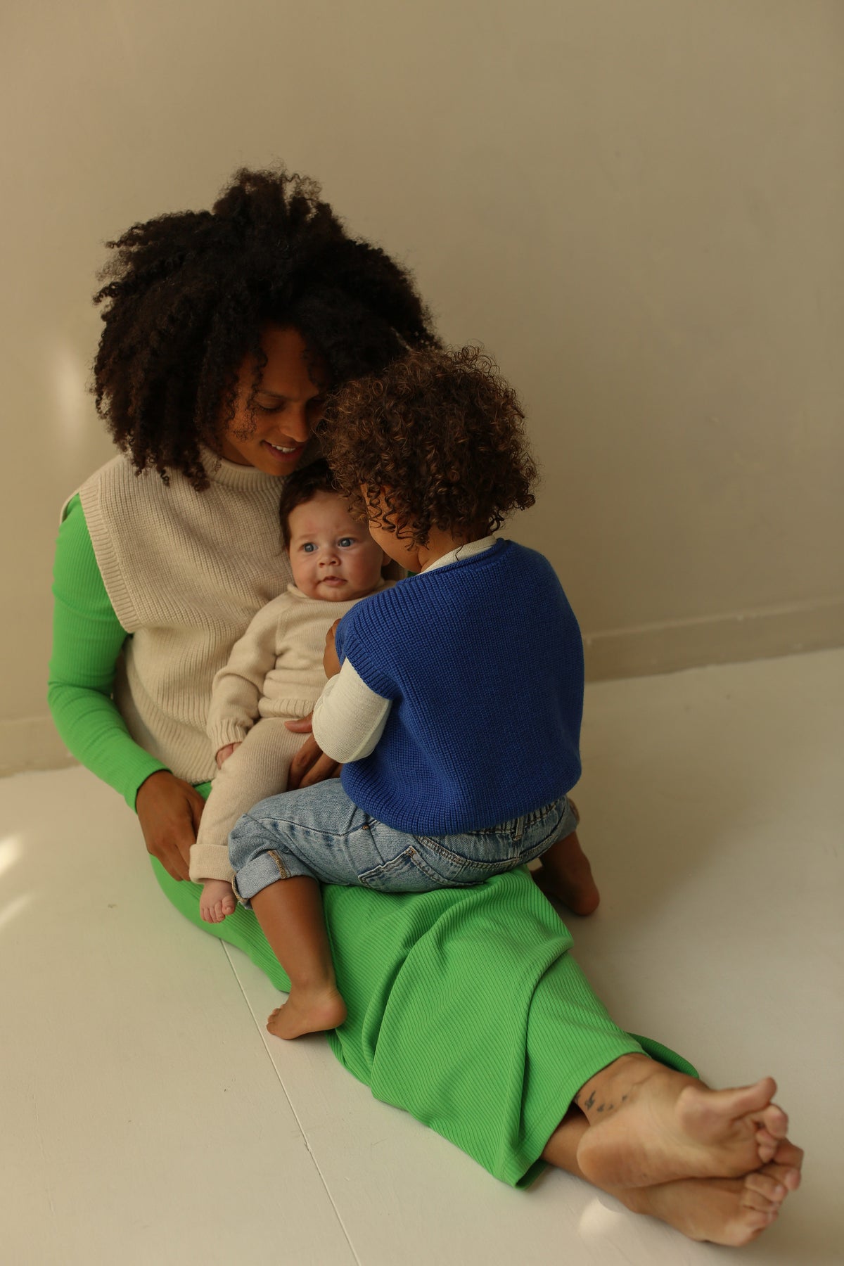 This seamless vest is knitted in one piece, what makes it very comfortable for babies. Thanks to our unique neckline, changing a baby is much easier. The collar stretches wide and is elastic. A subtle elastic thread in the collar allowing the neck to stretch when passing the head and then snugs on perfectly. The fisherman's rib makes it the softest vest. Combine it easily with a body to make a happy outfit.