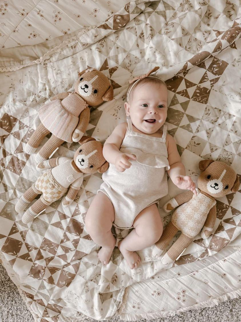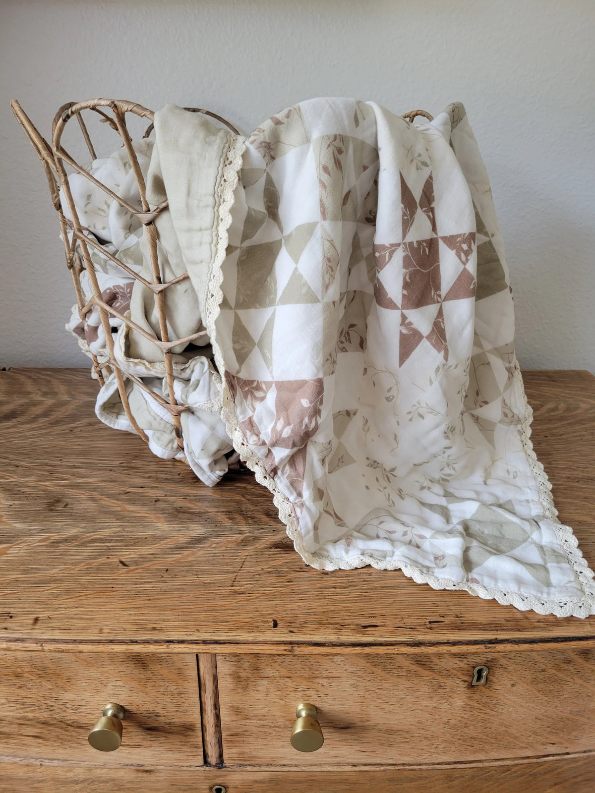 In collaboration with Ali Anni Design, the new Ivy Quilt features beautiful hand painted ivy leaves on a vintage quilt pattern. These beautiful blankets are made of a soft 6 layer gauze and feature a lace trim. They measure 45 x 45in giving your little ones a lot of room to grow with their new blankets. Perfect from birth, toddlerhood and beyond. They also make a great lap blanket for you too!