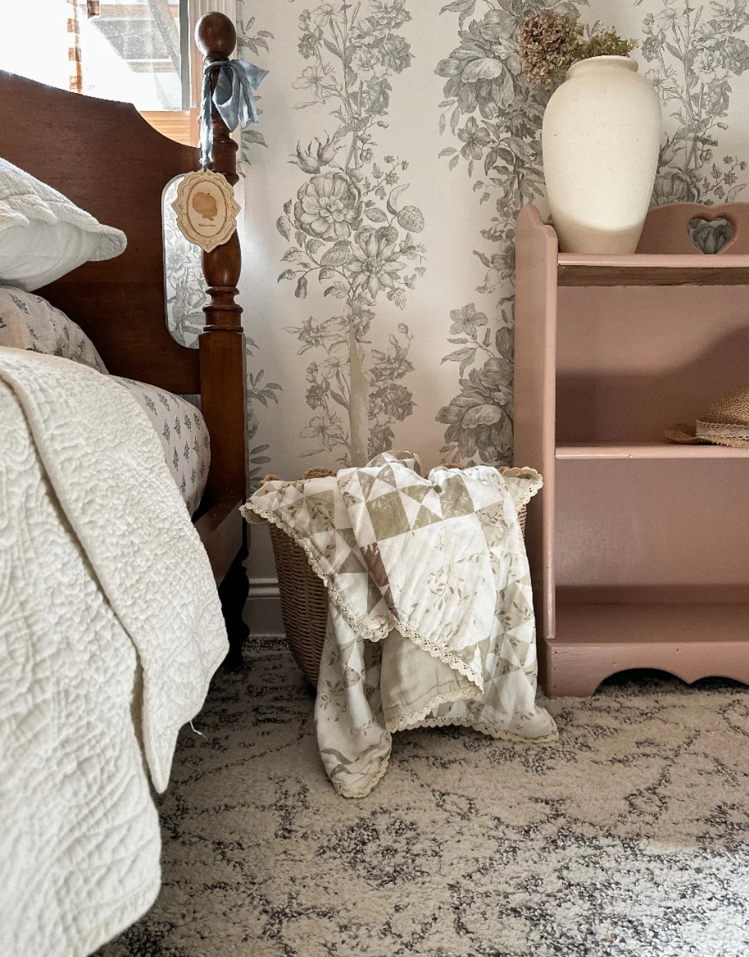 COLORS: Features a vintage ivy on a quilted pattern in neutral color palette on a coordinating sage green backing. Edging is a cream lace edge or a plain white edge.