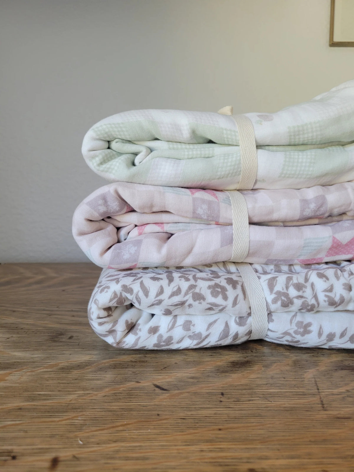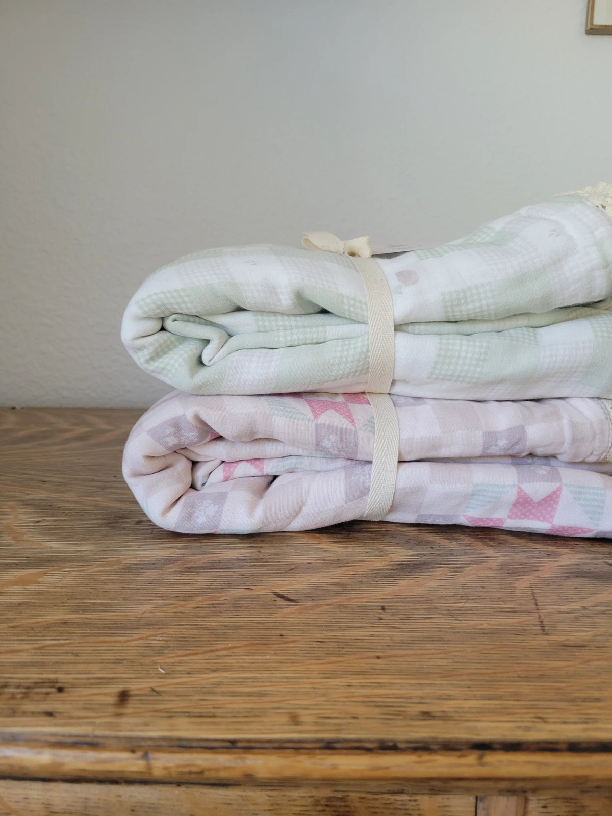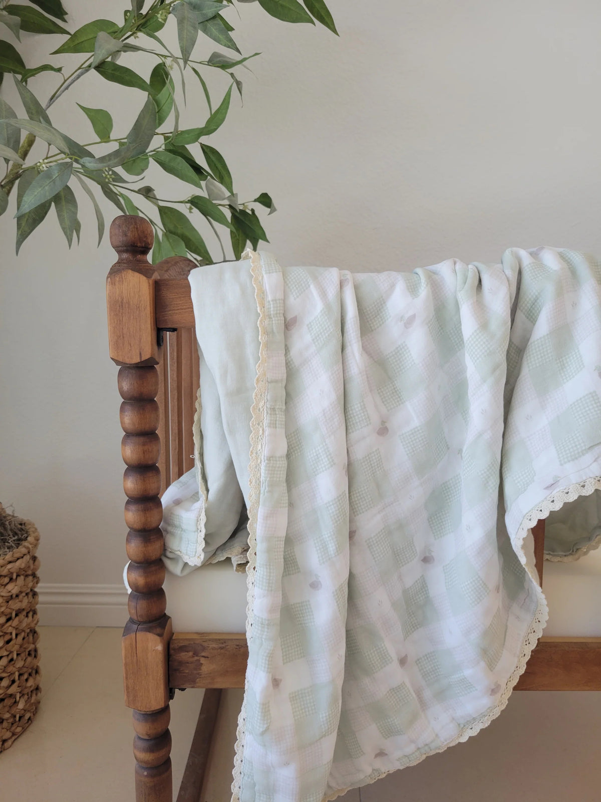 In collaboration with Molly from @thelildillsshop, the new Little Mallard Duck Quilt features hand painted ducklings on a green pattern quilt. These beautiful blankets are made of a soft 6 layer gauze and feature a lace trim. They measure 45 x 45in giving your little ones a lot of room to grow with their new blankets. Perfect from birth, toddlerhood and beyond. They also make a great lap blanket for you too!