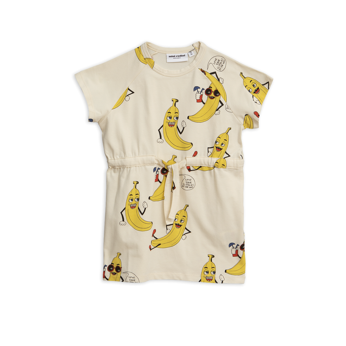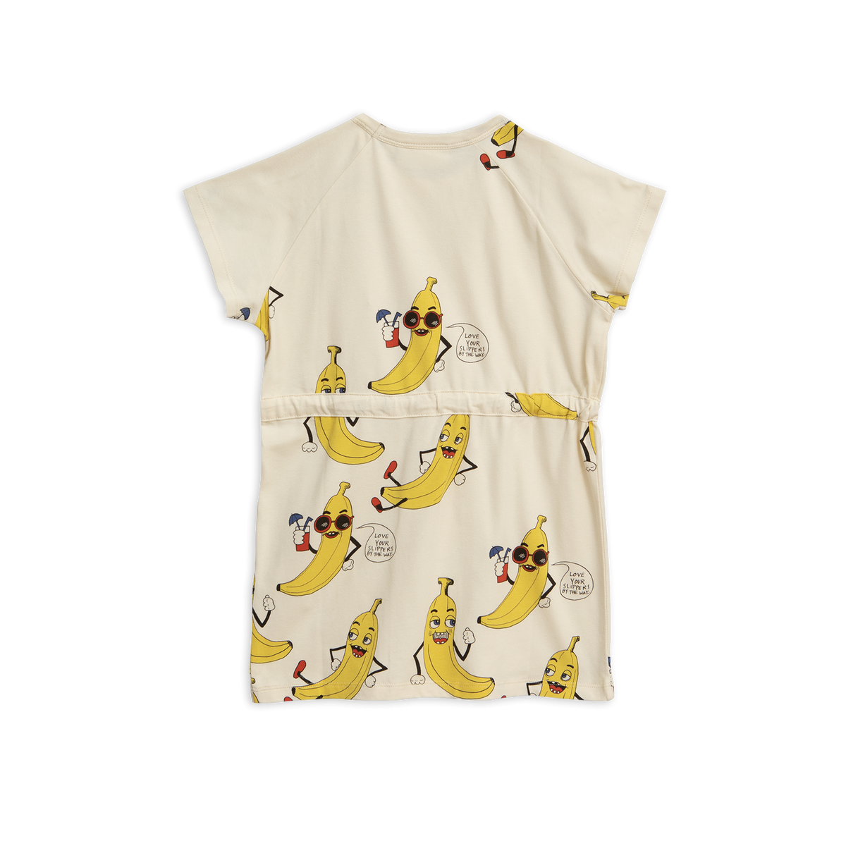 Off-white jersey dress made from GOTS certified organic cotton with a comfortable stretch an all-over banana print. The dress is styled with wide raglan sleeves and has a roomy straight fit with a drawstring at waist.