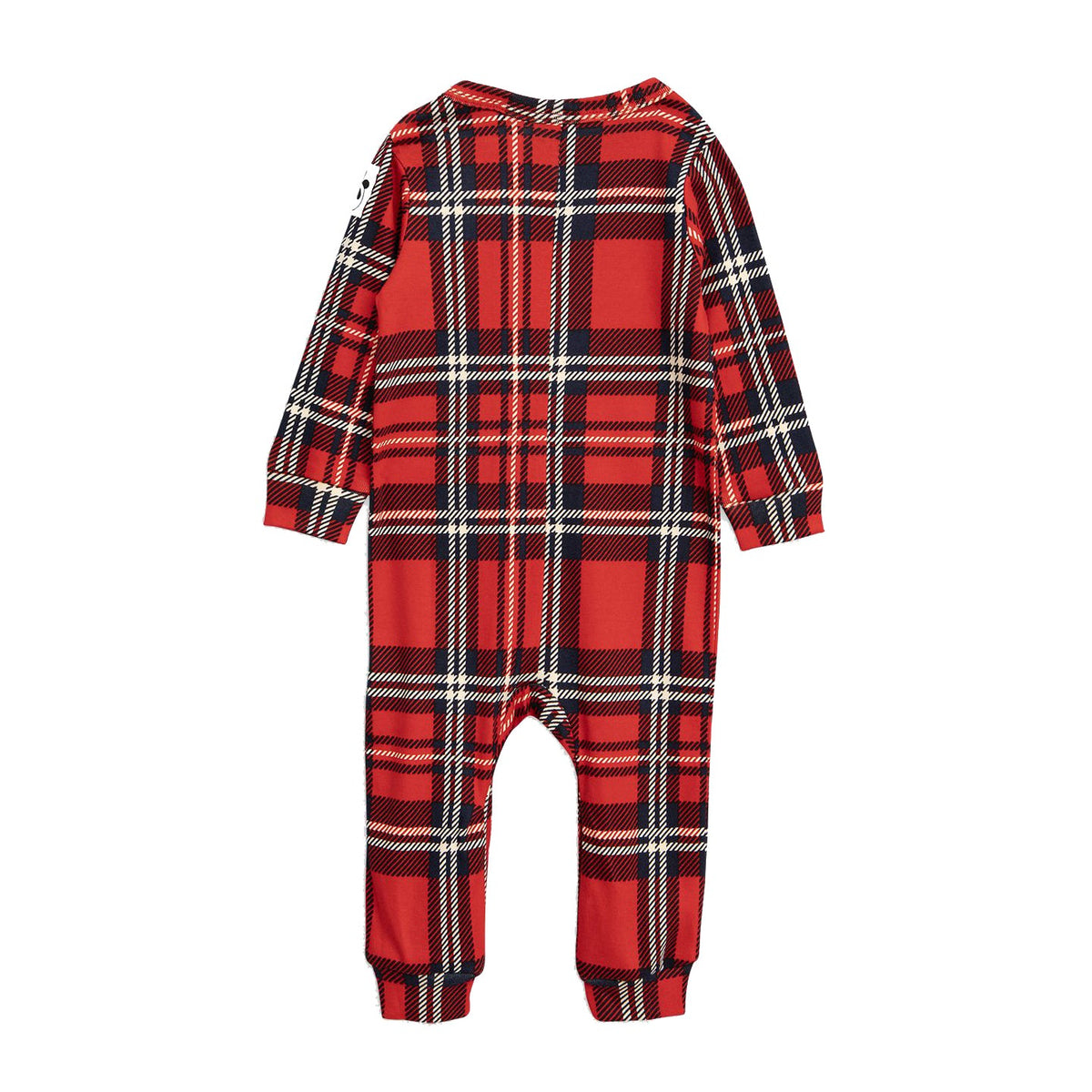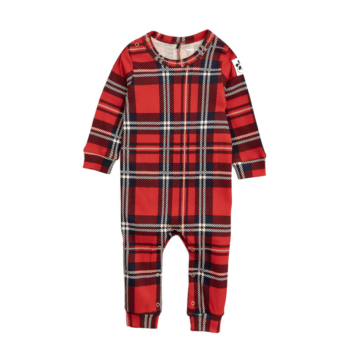 In 100% GOTS certified organic cotton, this red full-length jumpsuit has a tartan inspired print all over. Designed with cuffed sleeves and legs, it is decorated with a panda label on the left sleeve.