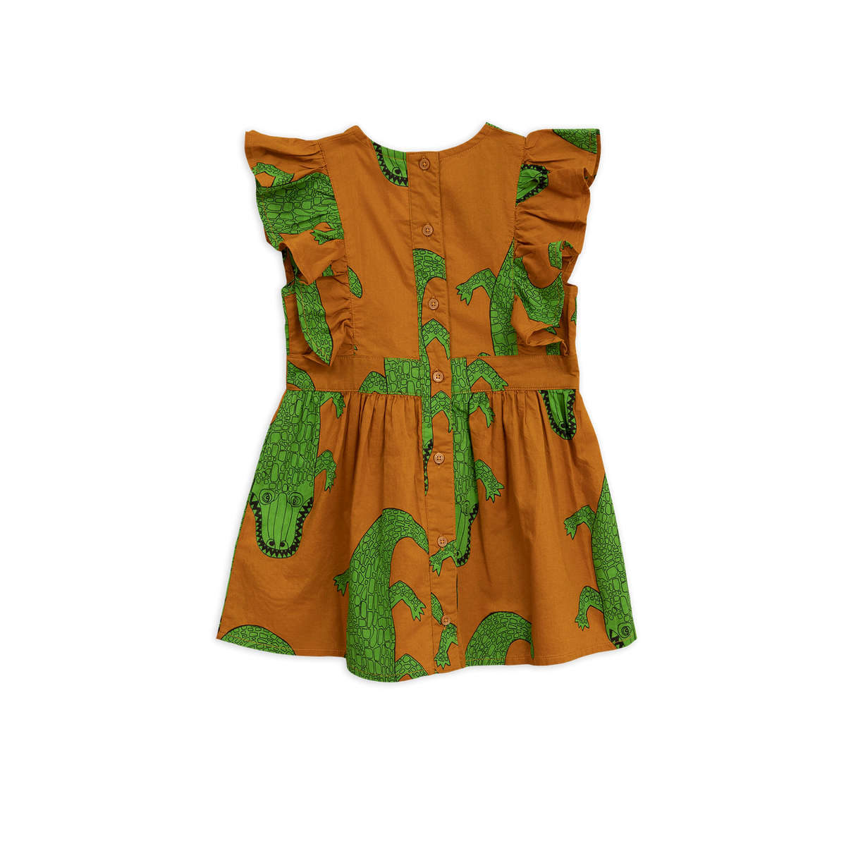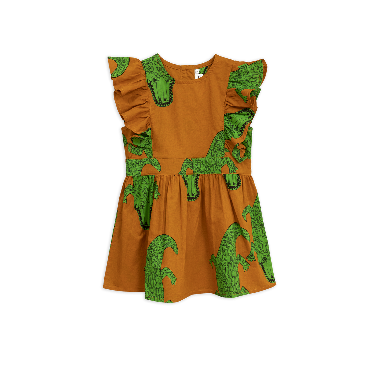 A festive knee-length dress in brown with printed crocodiles. Crafted from 100 % GOTS certified organic woven cotton in an airy quality. Featuring butterfly sleeves and ruffled details at front, gathered waist, and a buttoned opening at back.