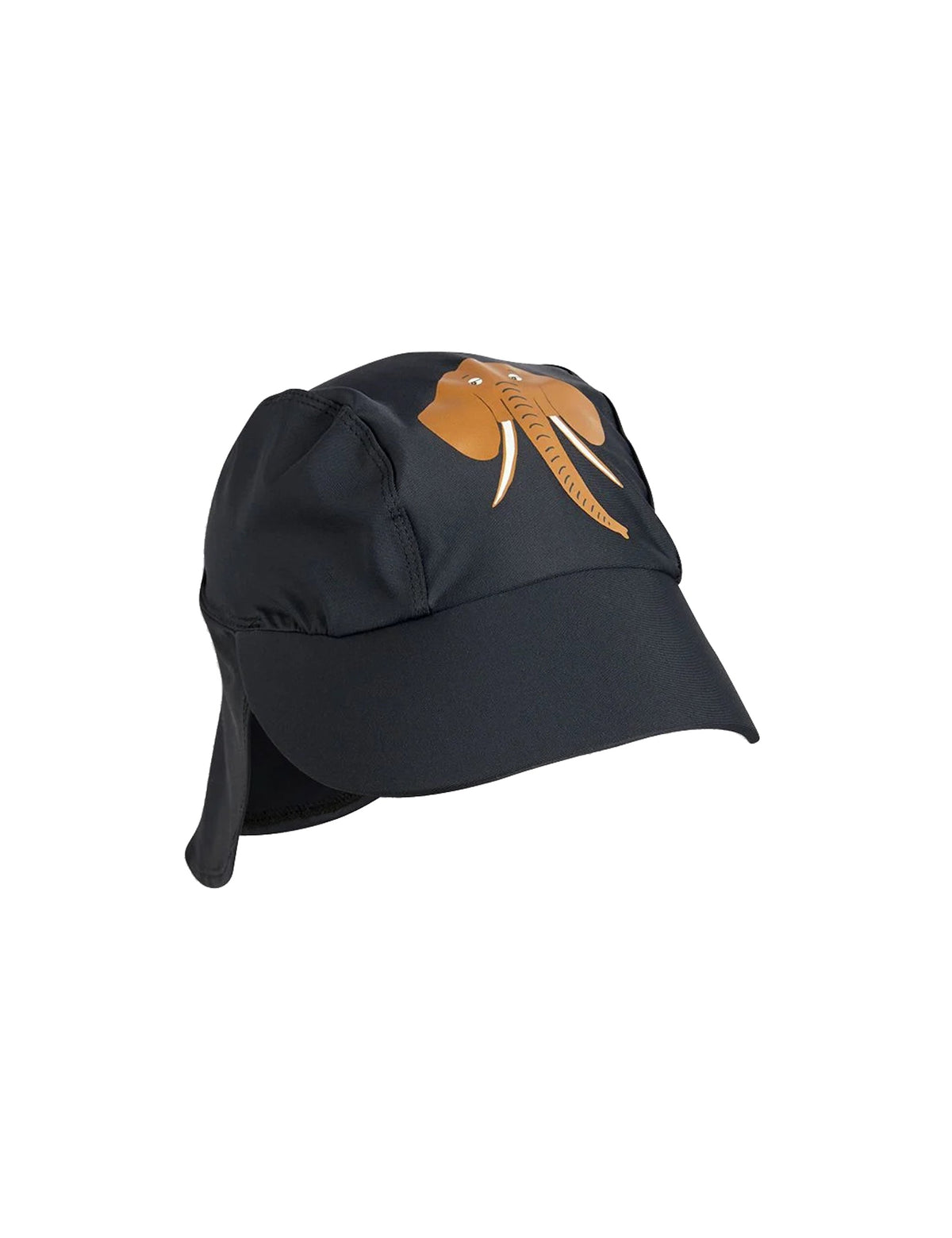 Protective black UV cap with Elephant print for kids, made from recycled polyamide with stretch. Shop sustainable childrens clothes at Mini Rodini.