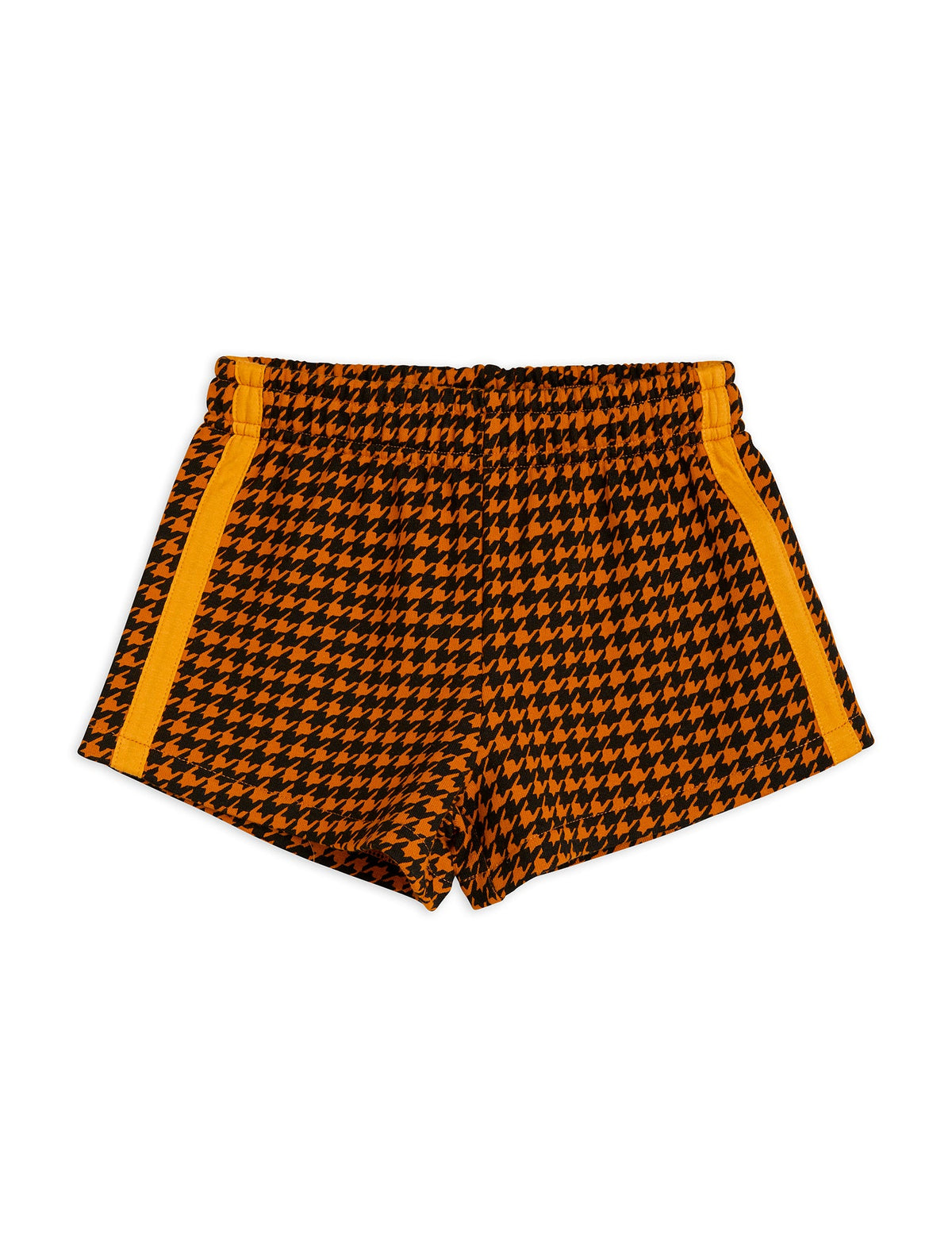 Comfy brown shorts with the classic Houndstooth print that never goes out of style, made completely from 100 % GOTS certified organic cotton. The shorts are designed with two contrast stripes on each side. They have an elastic waistband with a drawstring on the inside to keep them in place all day long.